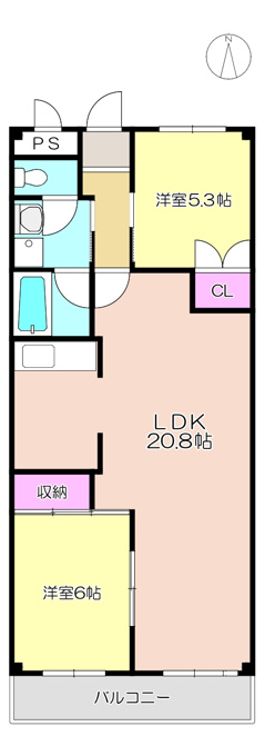 ①和室(南西)を洋室へ改造 ②洋室(南)とLDKの敷居撤去【2025.9施工】 新しい間取りは2LDK(洋室5.3帖・洋室6帖・LDK20.8帖)となります。